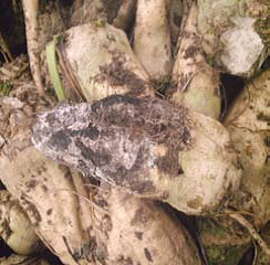 ذبول وتهدل الأوراق واصفرارها، وتتكون تقرحات مع وجود بقع ميتة واعفان على الجذور.