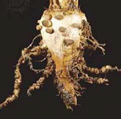 ظهور عقد نيماتوديه على الجذور والدرنات مصحوبه باصفرار في الأوراق وذبول وتقزم للنباتات.
