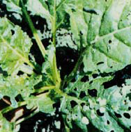 تحدث الحشرات الكاملة وأعمارها اليرقية المختلفة ثقوباً بسطح الأوراق فيما يشبه الطلق الناري وعند اشتداد الإصابة تصبح الورقة ممزقة ومهلهلة.