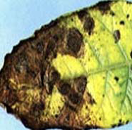 تظهر أعراض المرض على الأوراق في صورة بقع غير منتظمة، رمادية اللون، محاطة بهالة صفراء أو صفراء مخضرة، ويوجد على السطح السفلى لهذه البقع نمو زغبي أبيض أو رمادي عبارة عن الحوامل الجرثومية للفطر المسبب والإصابة على أعناق الأوراق والسوق على هيئة بقع طولية، رمادية اللون وفى الإصابة الشديدة يحدث كسر للسوق في حالة وجود تيار هوائي قوى أو رياح شديدة.