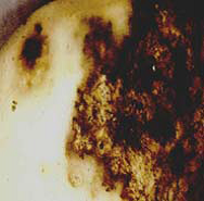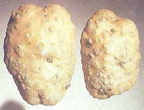 - على الدرنات: يوجد تورمات تظهر معها الدرنة مليئة بالبثور أو الثآليل ويوجد على نسيج الدرنة من الداخل بقع بنية داكنة اللون.
