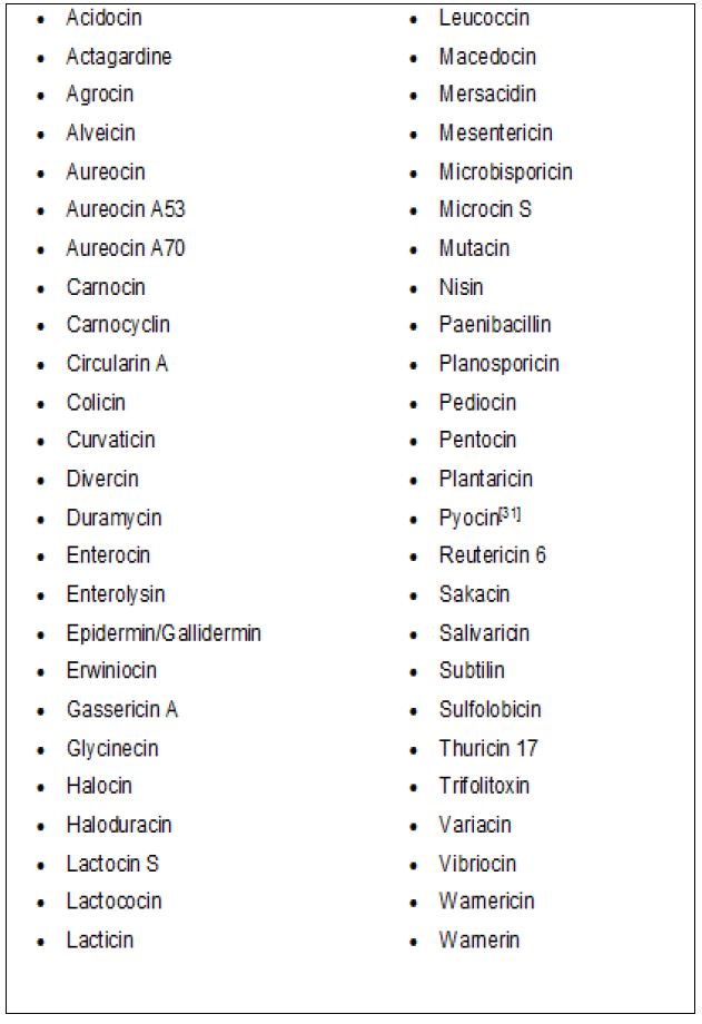مواد شبيهة بالمضادات الحيوية من ناحية فعاليتها، تفرز من قبل العديد من البكتريا للقضاء على الأحياء القريبة منها والأخرى التي تشاطرها البيئة، والطبيعة التركيبية لها بروتينية أو شبيهة بالبروتينات وتفرز عادة خارج الخلايا وتنشط بالبروتيزات.