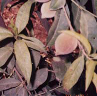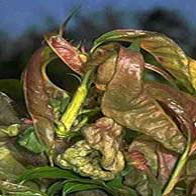 بقع صفراء باهتة على السطح العلوى للأوراق وحول العروق الوسطية وبتقدم الإصابة يحدث اصفرار شامل للأوراق والجفاف والسقوط.