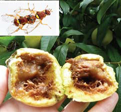 - في الثمار الناضجة يتحول مكان الوخز إلى لون مختلف ويصبح لينا ويخرج منه سائل عند الضغط على الثمرة، وينشأ هذا الضرر من تجوال اليرقات داخل الثمرة وتغذيتها على محتوياتها وكذلك تسرب البكتيريا والفطريات داخل الثمرة. مما يؤدى إلى سقوط الثمار.