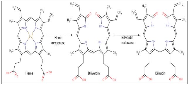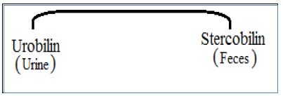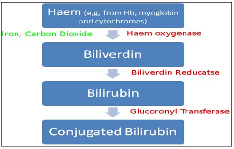 والهيم يتحول الى Unconjugated Bilirubin في Macrophages و Monocytes الموجودة في الطحال والشكل غير المقترن يكون غير ذائب في الماء نظرا لوجود الاواصر الهيدروجينية داخل وخارج الجزيئات المتكونة ، ويرتبط الى الالبومين ويرسل الى الكبد ، وهناك يرتبط المركب الى Glucuronic Acid ليكون النوع المقترن او المباشر واكثره يذهب الى الصفراء او الامعاء ، يفرز المركب في البول وافرازات الصفراء وزيادة مستوياته يمكن ان تشير الى وجود الامراض ، وهو المسئول عن اللون الاصفر في حالة اليرقان (ابوصفار ) ولون الغائط البني .