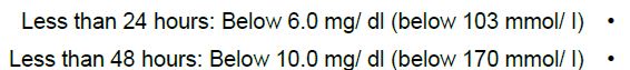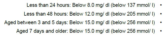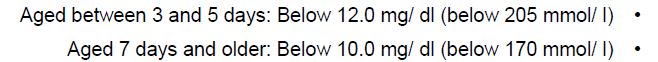 وتختلف النسب في الاطفال اعتمادا على موعد الولادة فالقيم الطبيعية في الخدج تختلف عن الولادات الطبيعية كما مبين في الاتي: الخدج
