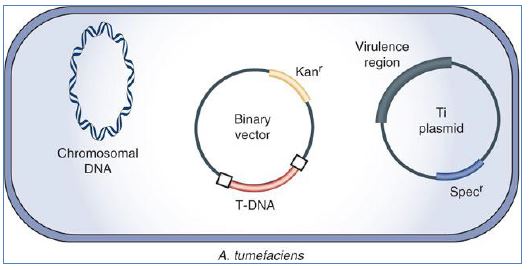 ناقل مكوكي لانه يستطيع التضاعف في اكثر من مضيف مثل Agrobacterium tumefaciens و Escherichia coli ، وهو نظام فيه T-DNA وجينات الضراوة vir Genes تقع على متضاعفات منفصلة ، كما في الشكل الاتي :