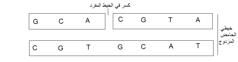 الشكل (2): تأثير الاشعة المؤينة على الحامض النووي المزدوج حيث تكسر احد الخيطين المزدوجين