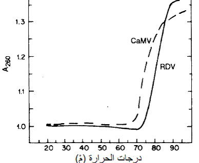 الشكل (1): منحني درجه الذوبان (Tm) للحامض النووي المزدوج لفايروسي موزائيك القرنابيط (CaMV) بقيمة 75م وتقزم الرز (RDV) بقيمة 85م مع ملاحظة تصاعد قيم الامتصاصية (المحور الصادي) بزيادة درجات الحرارة وزيادة انفكاك خيطي الفايروسين.