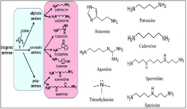 أمينات تنتج من الحوامض الأمينية نتيجة الفعاليات الحيوية للاحياء وقد تكون مستقيمة السلسلة أو حاوية على المركبات الحلقية ويوضح الشكل التالي أهم هذه الامينات وسوابقها من الحوامض الأمينية :