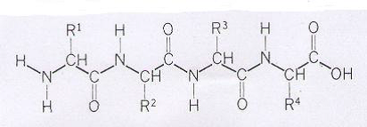 الشكل (6): التركيب الأولي للبروتين Primary structure المتكون من سلسلة الببتيد غير المتفرعة حيث تتعاقب فيها الأحماض الأمينية خيطيا وترتبط بالأصرة البتيدية التساهمية Peptide bond الرابطة بين ذرتي الكربون والنتروجين.(C-N)