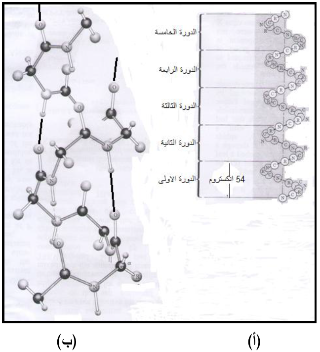 (ب) شكل مجسم للتركيب الحلزوني للببتيد من النوع "الحلزون الفا" يميني الاتجاه Right handed Alpha - Helix structure حيث تشير الخطوط الغامقة إلى الأصرة الهيدروجينية التي تثبت التركيب الحلزوني.