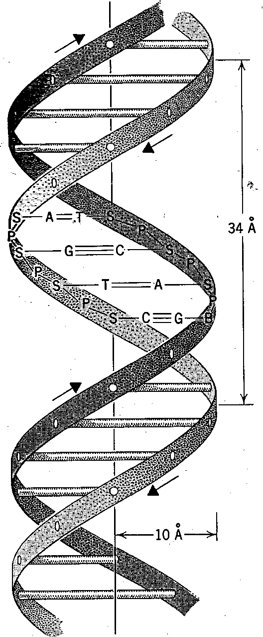 ترتبط قاعدتي الأدنين (A) والثايمين(T) بآصرتين هيدرروجينيتين، وترتبط قاعدتي الكوانين (G) والسايتوسين (C) بثلاثة أواصر هيدروجينية، أما الشريطين فيتكون كل منهما من الفوسفات (P) المرتبط بأصرة إسترية مع سكر الرايبوز منقوص الأكسجين، وأن طول دورة الحلزون ونصف قطره هو 34 و10 أنكستروم على التوالي.