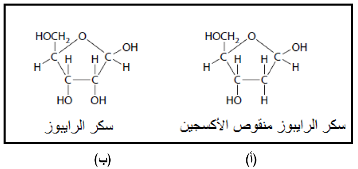 الشكل (2): (أ) سكر الرايبوز منقوص الاكسجين الموجود في الدنا (ب) سكر الرايبوز الموجود في الرنا.