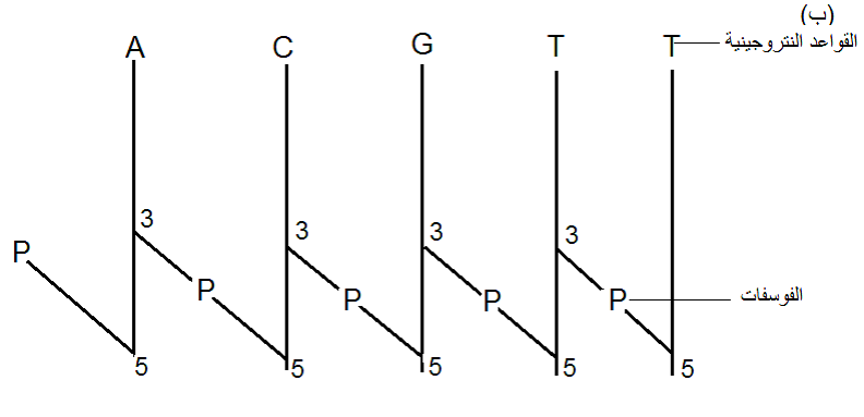 (ب) المخطط الرمزي للعمود الفقري للدنا والذي يقرا من اليسار الى اليمين PAPCPGPTPT