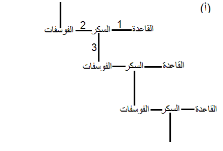الشكل (5): العمود الفقري سكر –Sugar- phosphate backbone لجزء من خيط الحامضين الرنا او الدنا (أ) المخطط العام للعمود الفقري حيث يشير الرقم (1) الى الاصرة الكلايكوسيدية والرقمين (2و3) الى اصرة الاستر.