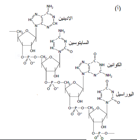 (أ) التركيب الكيماوي لقطعة من الحامض النووي الرايبي الفايروسي ( الرنا) RNA مكونة من القواعد الأربعة وهي الأدنين والكوانين (البيورينات) والسايتوسين واليوراسيل (البيريميدنات) وسكر الرايبوز والفوسفات وكيفية ارتباطها بالأصرة الكلايكوسيدية الرابطة بين السكر والقاعدة وأصرتي الإستر الرابطتين بين الفوسفات والسكر في ذات القاعدة وبين كل قاعدتين متجاورتين.