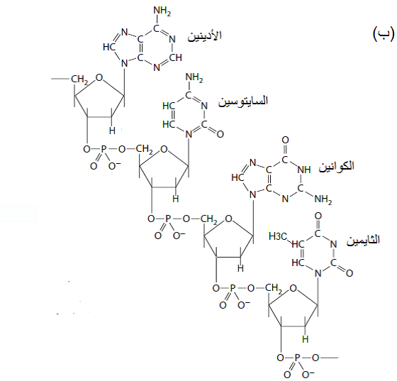 (ب) التركيب الكيماوي لقطعة من الحامض النووي الرايبي الفايروسي منقوص الأكسجين (الدنا) DNA مكونة من القواعد الأربعة وهي الأدنين والكوانين (البيورينات) والسايتوسين والثايمين (البيريميدنات) وسكر الرايبوز والفوسفات.