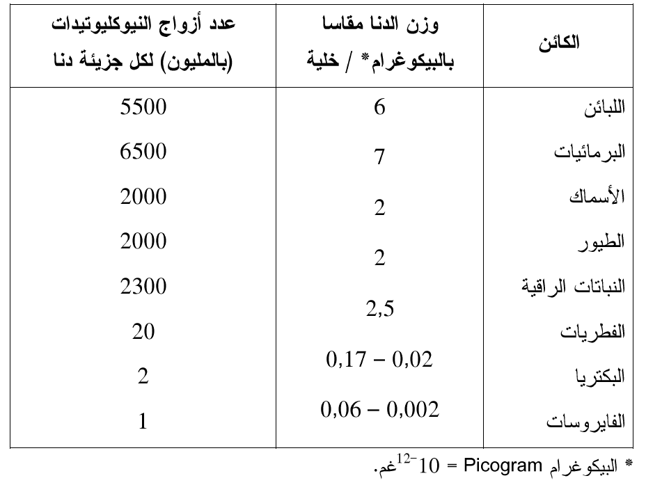الجدول (1): مقارنة لكمية الدنا في الفايروسات النباتية وأنواع من الكائنات الحية