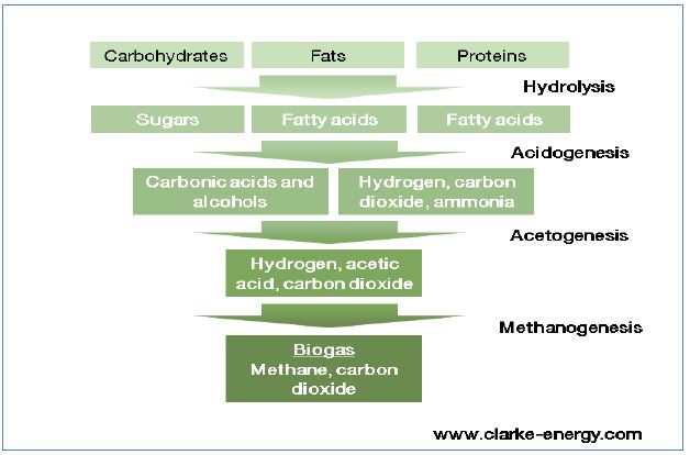 والمواد الأولية لإنتاج الميثان الحيوي Biomethane تشمل فضلات الإنسان والحيوان والمخلفات الزراعية الحاوية على أنواع مختلفة من المركبات العضوية . وعملية توليد الميثان حيوياً عملية معقدة وتتم بواسطة أنواع مختلفة من الأحياء المجهرية وتكون بشكل أساسي لا هوائية ، وتتم عملية توليد الميثان بثلاث مراحل رئيسة الأولى منها يمكن أن تكون هوائية وتشمل تحليل المواد المعقدة إلى مركبات بسيطة، تليها مرحلة تحويل هذه المركبات إلى حوامض عضوية أهمها حامض الخلAcetic Acid ثم تليها المرحلة الثالثة التي تتم تحت ظروف لا هوائية وتتحول فيها الحوامض العضوية إلى ميثان وثنائي أوكسيد الكاربون بواسطة البكتريا المولدة للميثان Methanogenic Bacteria كما موضح في الشكل الاتي :