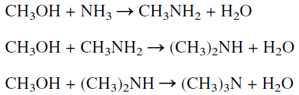 Methylamines can be synthesized by alkylating ammonia with methyl halides or with methyl alcohol. The reaction with methanol usually occurs at approximately 500°C and 20 atmospheres in the presence of an aluminum silicate or phosphate catalyst. The alkylation does not stop at the monomethylamine stage, because the produced amine is a better nucleophile than ammonia. The product distribution at equilibrium is: monomethylamine MMA (43%), dimethylamine DMA (24%), and trimethylamine TMA (33%):