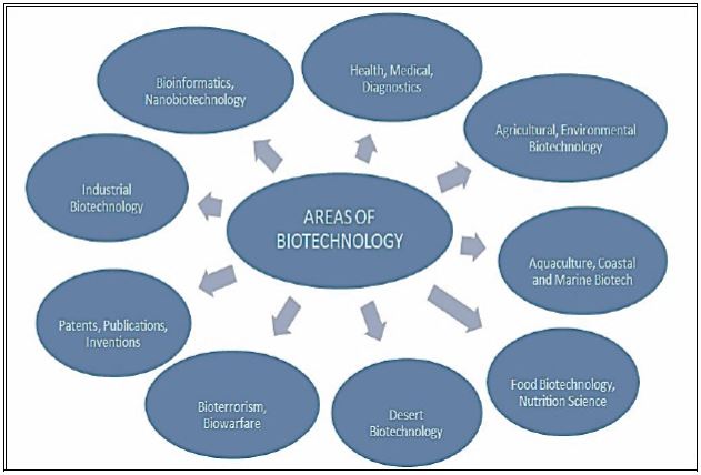 Microbial Biotechnology، Animal Biotechnology ، Plant Biotechnology (الذي يقسم بدوره على نوع الأحياء المستعملة) .