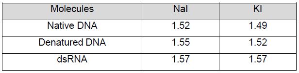 ولذلك تستعمل هذه القابلية او الخاصية لفصل DNA,RNA من محاليل NaI , KI بطريقة الطرد المركزي او ما يسمى بالطرد المركزي المتدرج Gradient Centrifuge والتي تتاثر بمحتوى الجزيئات من G+C والجدول التالي يوضح بعض هذه القيم :