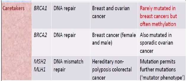 مجموعة من الجينات التي تنتج مواد تثبت الجينوم وعند حدوث طفرات فيها لا تؤدي الى السرطانات بشكل مباشروانما تؤدي الى زعزعة تزيد من حدوث الطفرات في جينات الحراسة Gatekeeper Genes التي تنظم نمو الورم . تحدث الطفرات فيها نتيجة للتعرض للمطفرات البيئية وعودة الجينات الى حالتها الطبيعية لا يلغي استمرار الورم . نواتجها تشارك في عمليات اصلاح القواعد ألاستئصالي و تشارك في MMR ومن امثلتها BRCA1 , BRCA2 , P53 وهذه الجينات تحافظ على صحة الجينات الاخرى أي تمنع الطفرات وتعمل ككابحات للورم :