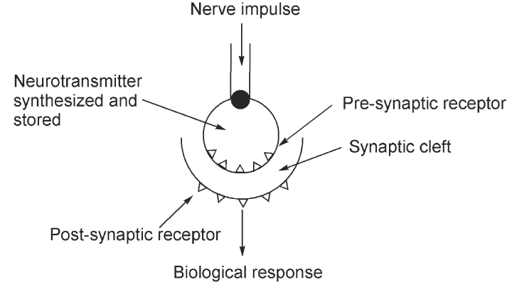 The autonomic system has two sections, which are joined by ganglia or a grouping of nerve cells. Transmission of information from the preganglionic to the post-ganglionic section is mediated by a neurotransmitter. The post-ganglionic neuron also uses a second neurotransmitter at the nerve ending. A neurotransmitter is released and crosses the narrow synaptic cleft to bind to a receptor. This binding to the receptor then brings about the effect of the nerve impulse. The voluntary or somatic nervous system differs from the autonomic nervous system by taking the information directly from the CNS to skeletal muscle without the intervention of ganglia.