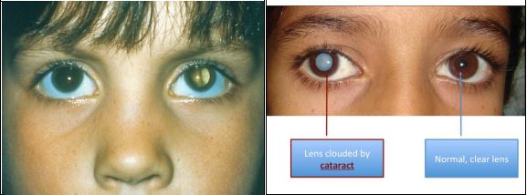 اعتمام وتضبب عدسة العين المؤدي الى ضعف البصر وهي اكثر اسباب العمى ، تحدث لكبار السن بشكل متدرج ، فضلا عن اسباب اخرى ومنها ارتفاع سكر الكلاكتوز Galactosemia الذي يحدث نتيجة لنقص الانزيم Galactose 1-P Uridylytransferase .ويقسم ارتفاع سكر الكلاكتوز الى ثلاثة انواع ، التقليدي منها يعود الى نقص الانزيم المذكور ، النوع الثاني يعود الى نقص انزيم Galactokinase ، والنوع الثالث نتيجة نقص انزيم UDP-Galactose-4-Epimerase. واكثر هذه الانواع هي ولادية أي ذات اسباب وراثية وتحدث منذ الولادة .