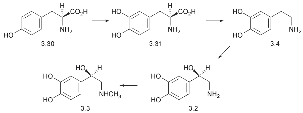 The biosynthesis of these compounds involves the hydroxylation of Ltyrosine 3.30 to L-dihydroxyphenylalanine (L-DOPA) 3.31, decarboxylation to form dopamine 3.4, hydroxylation to form noradrenalin 3.2 and finally N-methylation to give adrenalin 3.3. The first step in this sequence is rate-limiting. Once the compounds have been formed, they are stored in the nerve endings prior to their release.