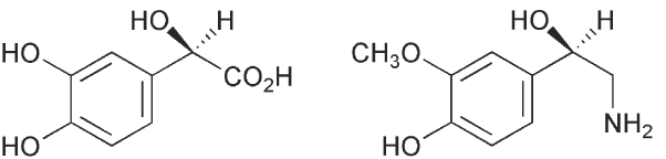 The hormones are metabolized by the monoamine oxidase pathway, which converts the compounds via their imines to the aldehydes and which are then oxidized to the acids e.g. 3.32. There are two forms of monoamine oxidase. Monoamine oxidase A metabolizes noradrenalin and serotonin while dopamine is metabolized by monoamine oxidase B. Another metabolic pathway involves the COMT system, which converts the phenolic hydroxyl group that is meta to the side chain, to a methoxyl, e.g. 3.33. The methyl ether may then be metabolized via the monoamine oxidase pathway to a hydroxy-acid. The compounds may also be excreted as their sulfates. These metabolic changes prevent the neurotransmitter from binding to its receptor. A regulatory mechanism involves the re-uptake of noradrenalin. This leads to the inhibition of its release and thus it provides a negative feedback regulation.