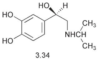 Although these neurotransmitters are chemically related, they have their own families of receptor, the dopaminergic and adrenergic receptors. In 1948 it was shown by Ahlquist that the adrenergic receptors may be divided by their responses to adrenalin and its analogues into two classes known as the α- and β-receptors. In particular only the β-receptors responded to the analogue, isoprenaline 3.34. Later, in 1967, Lands was able to show that the β-receptors could be further su β-divided into β1- and β2-receptors. The α-receptors are divided into a1 (post-synaptic) and a2 (pre-synaptic) families.