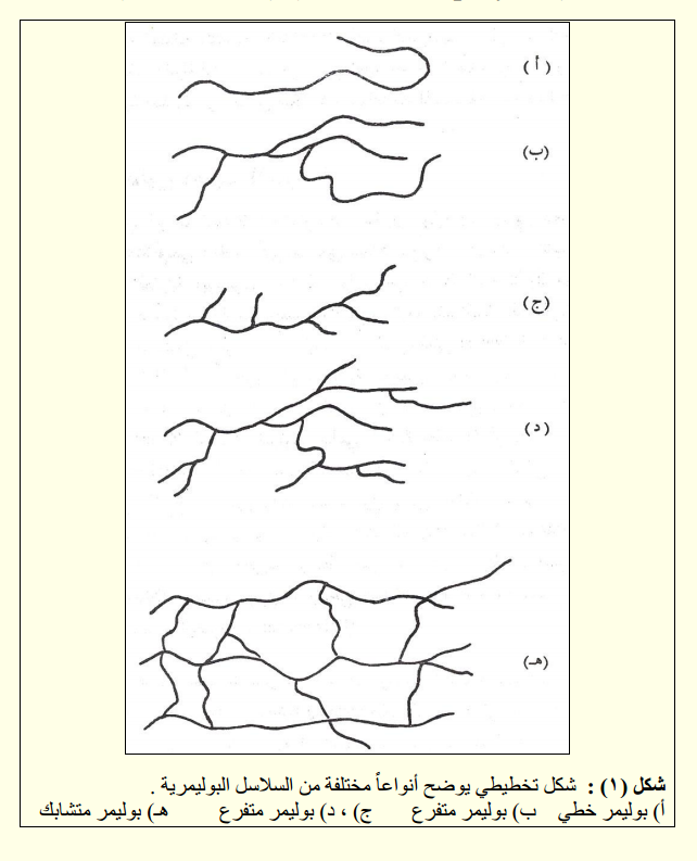 وأحياناً أخرى تكون الجزيئة البوليمرية متفرعة فيدعى بالبوليمر المتفرع (branched polymer) وقد تكون الفروع في سلسلة البوليمر ذات تركيب مشطي (comb form) أو ذات تركيب سلمي (ladder form) او ذات شكل صليبي (cruciform). وقد تختلف هذه التفرعات في أطوالها ويمثل الشكل (1) شكل تخطيطي لأنواع من البوليمرات المتفرعة وفي بعض الحالات تكون هذه التفرعات متشابكة مع بعضها فيدعى بالبوليمر المتشابك (crosslinked polymer) (لاحظ الشكل 1).