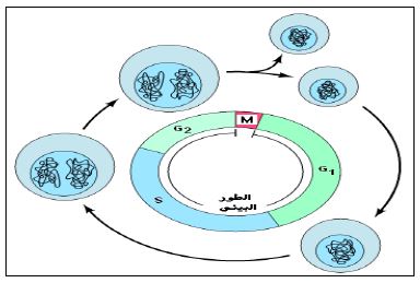 Mitosis ) M Phase) : ويعني الانقسام الخيطي الذي يعقبه انقسام السايتوبلازم ويمتد لمدة حوالي ساعة في الخلايا البشرية سريعة الانقسام والتي يكون زمن دورتها 24 ساعة .