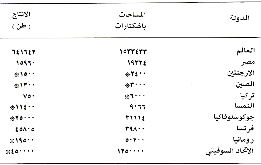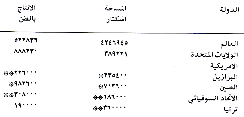 بلغت المساحات العالية المزروعة بها لسنة ۱۹۷4 بأكثر من (۷۳۳) مليون هكتار انتجت اكثر من (۱۳۳۳) مليون طن والدول المشهورة بإنتاجها هي الصين يليها الولايات المتحدة الامريكية ثم الاتحاد السوفياتي. اما اهم الاقطار العربية المنتجة لها فهي مصر والمغرب والسودان ثم سوريا فالعراق.