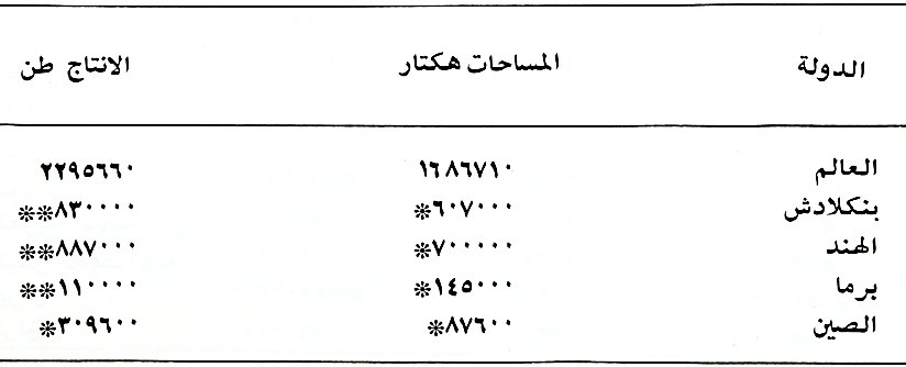 بلغت المساحات المزروعة به سنة 1974 حوالي (137) مليون هكتار والانتاج حوالي (323) مليون طن والدول المشهورة بإنتاجه هي: الصين الشعبية والهند وإندونيسيا وبنكلادش. اما الاقطار العربية المنتجة له فهما مصر والعراق.