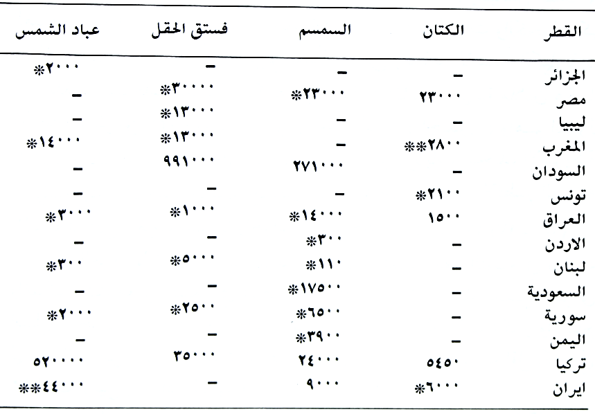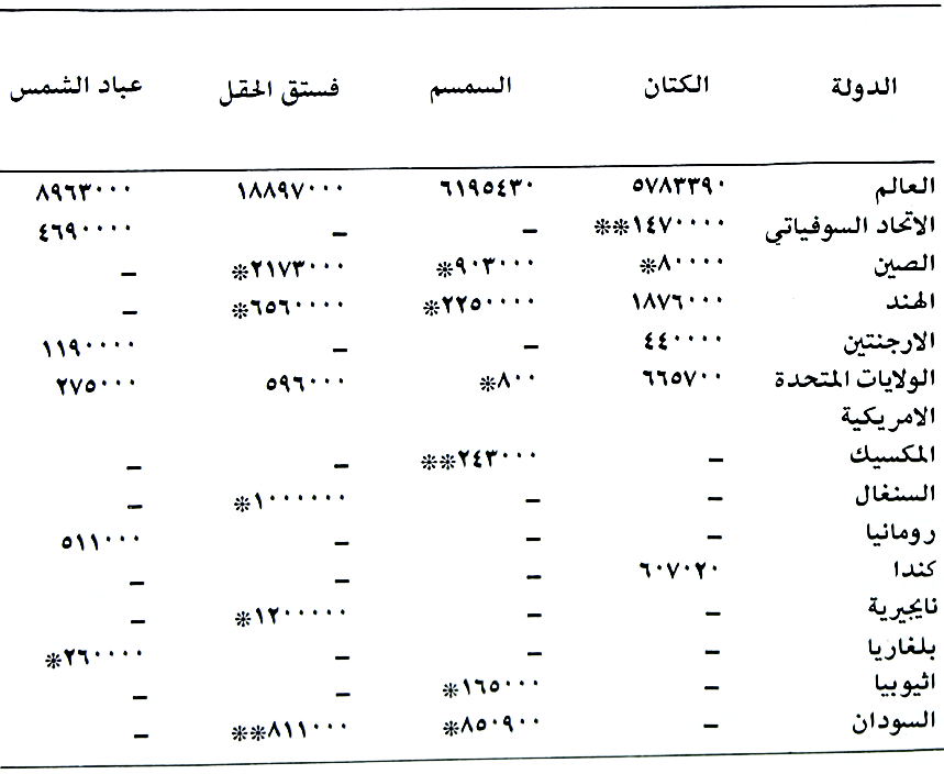 بلغت المساحات العالمية المزروعة به اكثر من ستة ملاين هكتار والانتاج بحوالي مليونين طن والدول المشهورة بإنتاجه هي الهند والصين واثيوبيا اما الاقطار العربية التي تنتجه فهي السودان وبدرجة اقل في مصر والسعودية. بلغت المساحات التي زرعت به في العراق (17.500) هكتار والانتاج (14000) طن والحافظات المشهورة بإنتاجه هي: ديالى وبابل وواسط كما يزرع في محافظات اخرى ولكن بدرجة اقل مثل التأميم وميسان والانبار. جدول (۱۳) يبين المساحات الكلية للمحاصيل الزيتية المهمة بالهكترات للعالم والدول العالمية المشهورة بإنتاجها لسنة 1974.