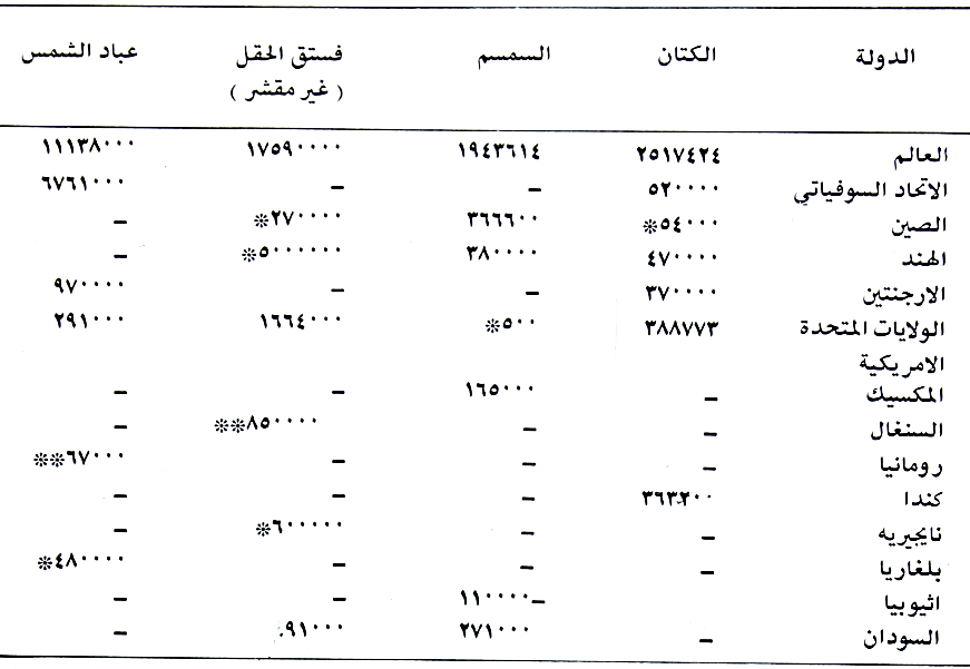 بلغت المساحات العالمية المزروعة لغرض الزيت بحوالي (5.8) مليون هكتار والانتاج اكثر من (2.5) مليون طن وان الدول المشهورة بإنتاجه هي: الاتحاد السوفييتي والهند والارجنتين وكندا والولايات المتحدة الامريكية (حسب الجدولين 13 و 14) اما الاقطار العربية المهمة بإنتاجه فهي: مصر وبدرجة اقل في تونس والغرب حسب الجدولين (15 و16) تبلغ المساحة المزروعة به في العراق الفي هكتار والانتاج (1500) طن والمحافظات المشهورة بإنتاجه هي: واسط وديالي كما يزرع بمساحات صغيرة في محافظات التأميم وبغداد والانبار وميسان.