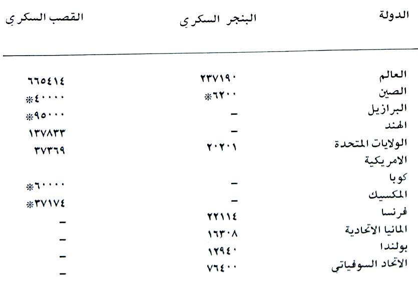 جدول (18) يبين المساحات الكلية المزروعة بالمحاصيل السكرية المهمة بألاف الهكتارات للعالم وللدول العالمية المشهورة بإنتاجها لسنة 1974.
