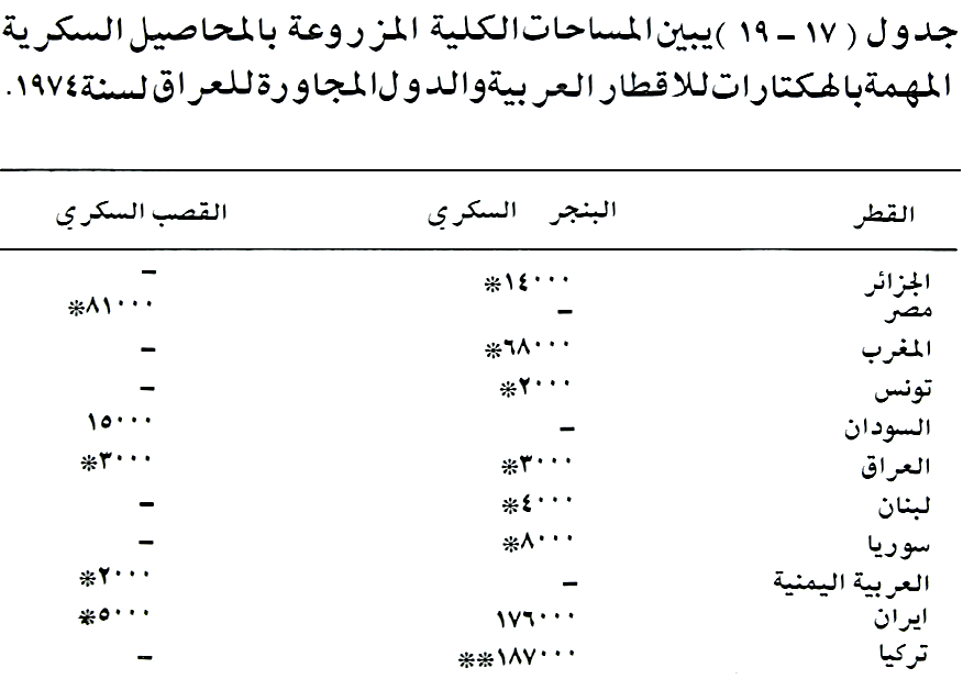جدول (19) يبين المساحات الكلية المزروعة بالمحاصيل السكرية المهمة بالهكتارات للأقطار العربية والدول المجاورة للعراق لسنة 1974:
