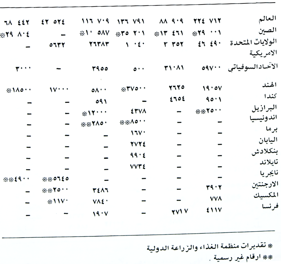 جدول (1) يبين المساحات الكلية المزروعة بألاف الهكتارات للعالم والدول العالمية المشهورة لمحاصيل الحبوب المهمة لسنة 1974