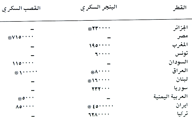 جدول (۲۰) يبين الانتاج الكلي بالأطنان للمحاصيل السكرية المهمة للأقطار العربية والدول المجاورة للعراق لسنة 1٩٧٤.