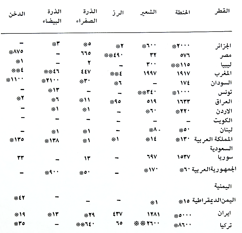 جدول (4) يبين الانتاج الكلي بألاف الاطنان للأقطار العربية والمجاورة للعراق لمحاصيل الحبوب المهمة لسنة 1974