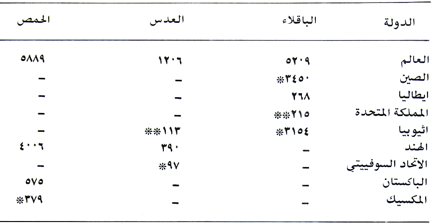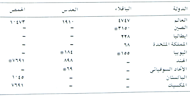 جدول (5) يبين المساحات الكلية المزروعة بالمحاصيل البقولية المهمة بألاف الهكترات للعالم والدول المشهورة بإنتاجه السنة 1974