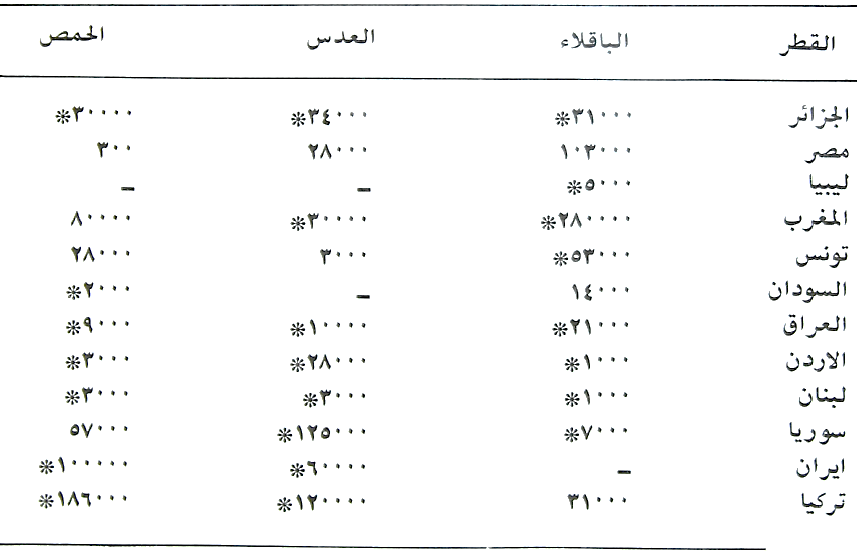 جدول (3) يبين المساحات الكلية بألاف الهكتارات للأقطار العربية والدول المجاورة للعراق لمحاصيل الحبوب المهمة لسنة 1974