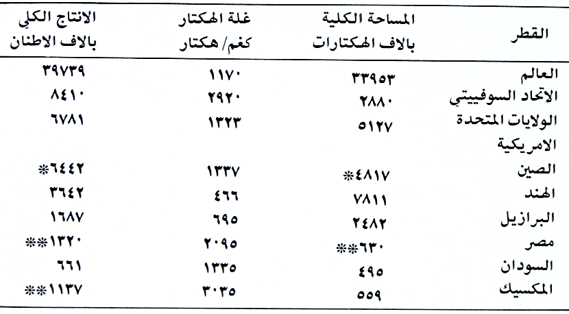 تعتبر الحنطة من اهم المحاصيل الغذائية في العالم لأنها تكون المصدر الاول للخبز وهي من المحاصيل الشتوية المهمة. بلغت المساحة العالمية المزروعة بها سنة 1974 حوالي 225 مليون هكتار والانتاج (360) مليون طن وان اهم الدول المنتجة لها هي الاتحاد السوفييتي والولايات المتحدة الأمريكية والصين الشعبية والهند حسب الجدولين (1 و 2).