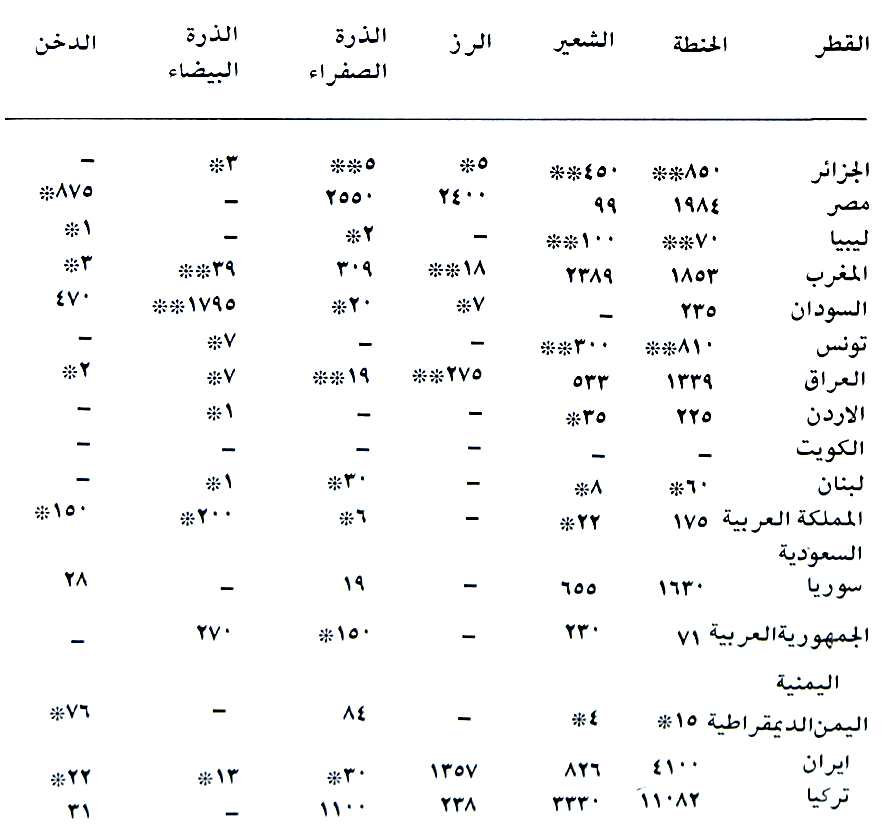 جدول (3) يبين المساحات الكلية بألاف الهكتارات للأقطار العربية والدول المجاورة للعراق لمحاصيل الحبوب المهمة لسنة 1974