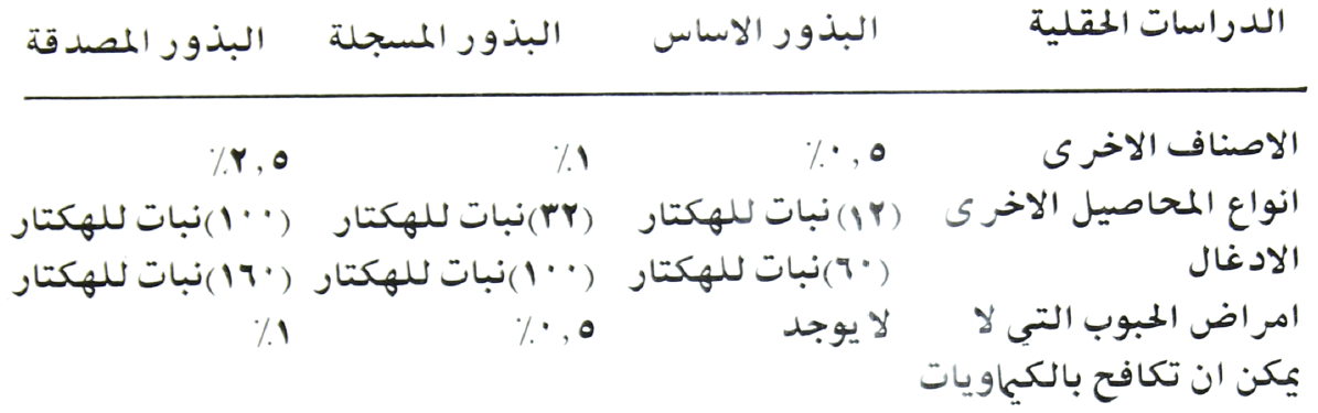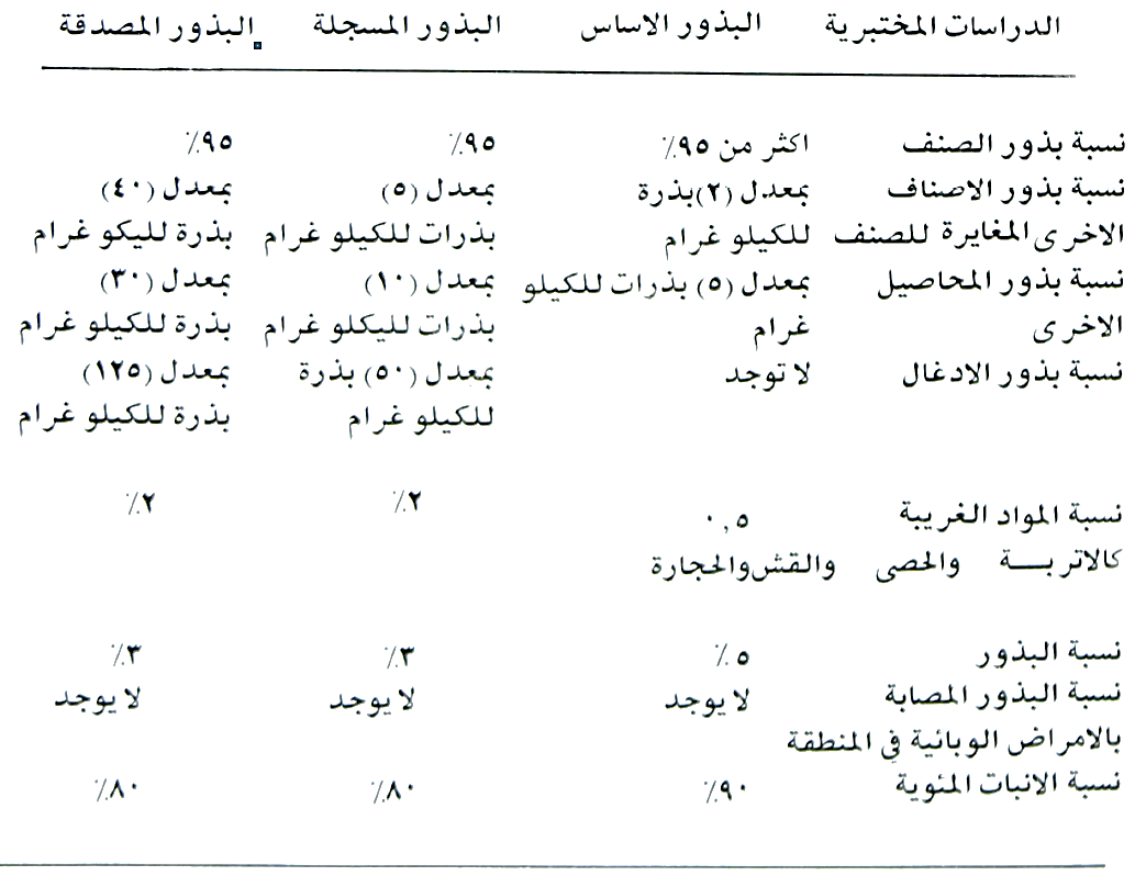 ولغرض رفع الكفاية الانتاجية للمحصول وتحسين نوعيته والمحافظة على صفاته الوراثية فان من الضروري استعمال البذور التي تقل فيها الشوائب المختلفة المذكورة اعلاه حتى تصبح صالحة للزراعة ومصدقة (Certified) ولتحقيق هذا الغرض فانه لا بد من تفتيش الحقول المخصصة لإنتاج البذور المصدقة وذلك حسبما مبين في الجدول (1) وكذلك فحص البذور الناتجة منها مختبريا وذلك كما مبين في الجدول (۲). ان انتاج البذور من الحقول التي تتوفر فيها الشروط الحقلية والمختبرية، الخاصة بإنتاج البذور المصدقة يتم باتباع الاسس العامة التالية: