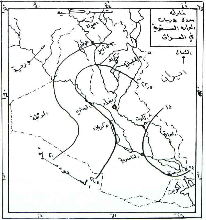 اما بالنسبة لدرجات الحرارة فترتفع صيفا حتى تصل الدرجة القصوى الى 50 درجة مئوية في بعض الايام خلال شهر آب وخاصة في السهل الرسوبي الا ان هذا الارتفاع في درجة الحرارة يعوض بانخفاض خلال الليل بما لا يقل عن 20 درجة مئوية من العظمى وتنخفض درجات الحرارة خلال كانون الثاني حتى تصل الصغرى إلى الصفر او دونه في بعض السنوات. ان الانخفاض الشديد لدرجات الحرارة خلال الشتاء يؤدي إلى تلف بعض المحاصيل خاصة الخضروات والفاكهة وعلى الاخص الحمضيات عندما يحصل التجمد والصقيع لفترة طويلة الشكل التالي.
